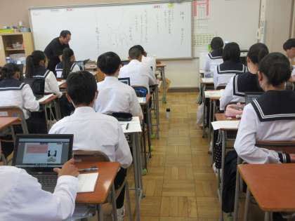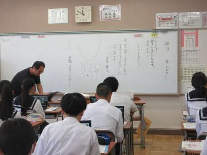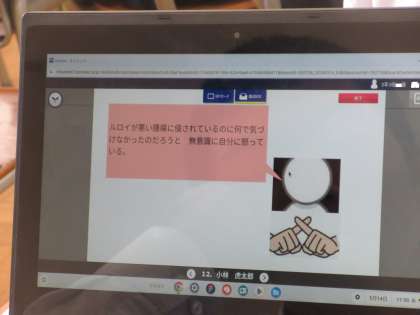 5月14日(火)授業の様子(3年3組 国語) 公開日 2024/05/14 更新日 2024/05/14 できごと 現在、井上ひさし作の「握手」を教材とした読解の授業を行っています。今日は、タイトルでもある握手に込められた意味や想いについて考えました。タブレットPCで考えの交流を図りながら、内容を深く考察していきました。
