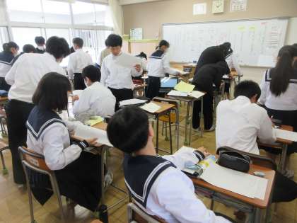 2年生の国語は「自分流『枕草子』をまとめ交流しよう」をめあてにした学習です。これまでに学習した枕草子を参考にして、テーマを決めて四季についての各々の思いを書きました。今日は、クラスで読み合い、コメントを書いて交流を図りました。