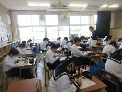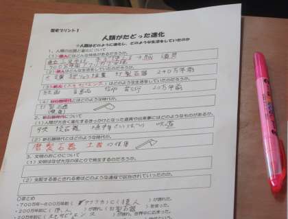 5月17日(金)授業の様子(1年2組 社会) 公開日 2024/05/17 更新日 2024/05/17 できごと 歴史の学習です。人間はどのように進化し、どのような生活をしていたのか考察しました。猿人、原人、新人の特徴や旧石器時代と新石器時代の様子など、違いを確認しながらワークシートにまとめました。