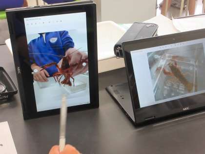 6月6日(木)授業の様子(1年2組 理科) 公開日 2024/06/06 更新日 2024/06/06 できごと ザリガニの体のつくりについて観察を行いました。実際にザリガニを手に取ったり、タブレットPCで写真を撮ったり、様々な方法で興味深く観察をしていました。