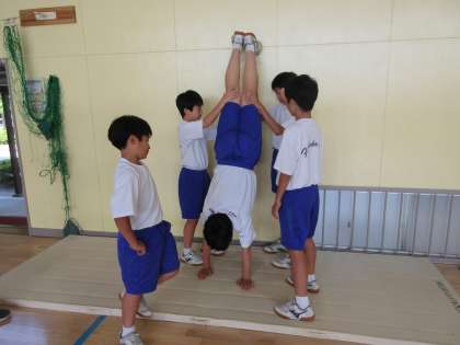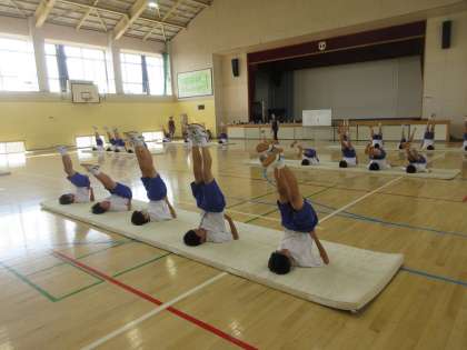 6月6日(木)授業の様子(1年3組 体育) 公開日 2024/06/06 更新日 2024/06/06 できごと 6校時、教育実習生が1年3組で研究授業を行いました。これまでのマット運動では、前転技、後転技を行ってきましたが、今日から倒立技にチャレンジです。背倒立を練習した後、友達と協力しながら補助付きで倒立練習を行いました。