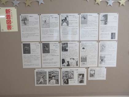 6月7日(金)新刊本の紹介 公開日 2024/06/07 更新日 2024/06/07 できごと 図書室の廊下に新刊本の紹介コーナーがあります。新刊本の表紙とともに概要が書かれた紹介カードが掲示されました。気軽に図書室に行き、おもしろそうな本を手に取ってほしいと思います。