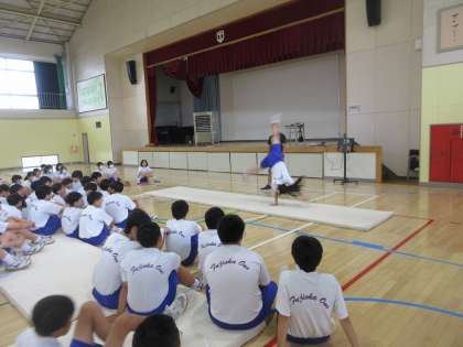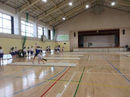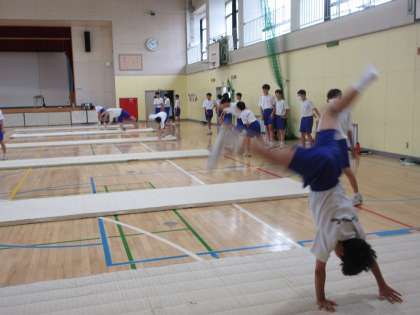 マット運動で側転やロンダードに挑戦しました。着地の際の体の向きにより、側転がロンダードに発展していきます。マットの縫い目を目印に、真っ直ぐダイナミックな技になるよう練習を行いました。