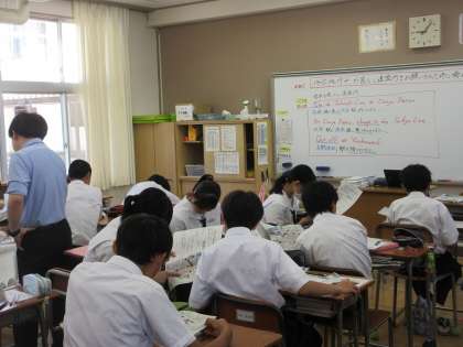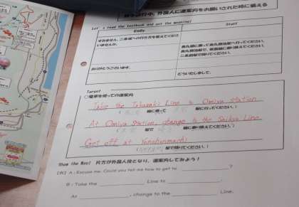 6月19日(水)授業の様子(3年1組 英語) 公開日 2024/06/19 更新日 2024/06/19 できごと 修学旅行中、外国人に道案内をお願いされたら・・・そんな場面を想定して、道案内の表現を学習しています。修学旅行の事前学習で使用しているガイドブックを見ながら、実際の説明を考えていました。