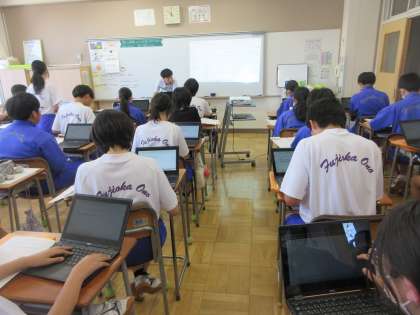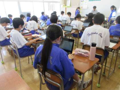 6月19日(水)授業の様子(2年3組 英語) 公開日 2024/06/19 更新日 2024/06/19 できごと 外国の友人に日本の災害への備えについて伝える紹介文を作成しています。タブレットに打ち込み、クラスで共有しながら表現方法の定着を図ります。