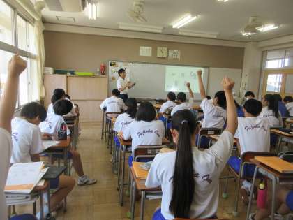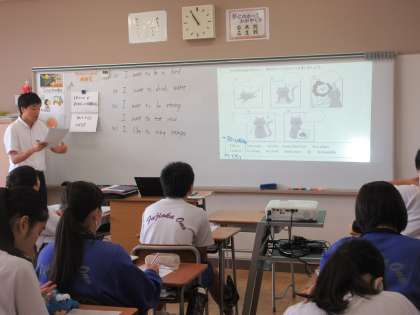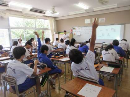 不定詞の学習です。英文作成では、たくさんの生徒が、積極的に挙手をして発言しています。