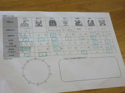 9月26日(木)授業の様子(2年2組 技術科) 公開日 2024/09/26 更新日 2024/09/26 できごと これからの発電方法について考えました。エネルギー自給率が低い日本が、様々な発電方法のプラス面やマイナス面を考慮しながら、最適な発電方法の組み合わせ(エネルギーミックス)を提案しました。