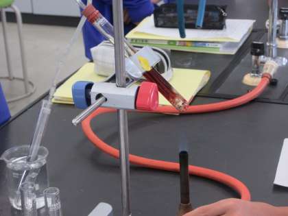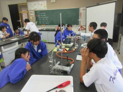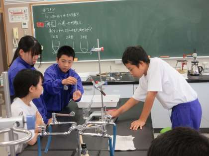 10月7日(月)授業の様子(1年2組 理科) 公開日 2024/10/07 更新日 2024/10/07 できごと 赤ワインからエタノールを取り出す実験を行いました。沸点の違いで、取り出した液体の特徴を確認しながら、蒸留の仕組みについて理解を深めています。