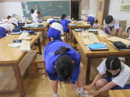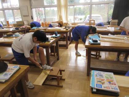 10月24日(木)授業の様子(1年3組 技術科) 公開日 2024/10/24 更新日 2024/10/24 できごと 木工作品の制作も木材の加工段階になりました。今日は、多くの生徒がのこぎりを使い、切断線にそって木材をカットしていました。ペアになり協力しながら、作業している生徒も見られました。