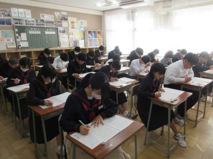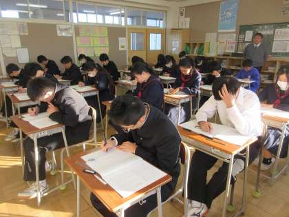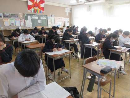 1月9日(木)冬休み明けテスト(2年生) 公開日 2025/01/09 更新日 2025/01/09 できごと 冬休み明けテストを行いました。事前に出題範囲表が配られており、冬休み期間中もテストに向けて準備を進めていた生徒も少なくありません。最後まで諦めずに、テストに向かっていました。 (上:1組、中:2組、下:3組)