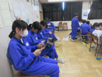 2月27日(木)授業の様子(2年1組 英語) 公開日 2025/02/27 更新日 2025/02/27 できごと 自分の夢について英語で表現しました。スピーキングの様子を記録した動画を担当やALTの先生に見てもらいます。clear voice、eye contact、reaction、smile の評価ポイントをクリアできるよう、タブレットPCに向かいながら、繰り返し練習していました。
