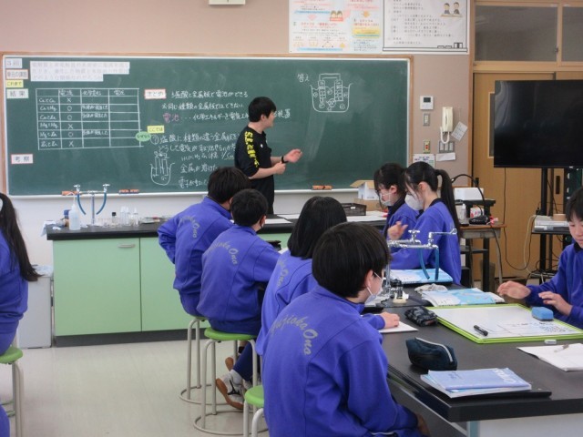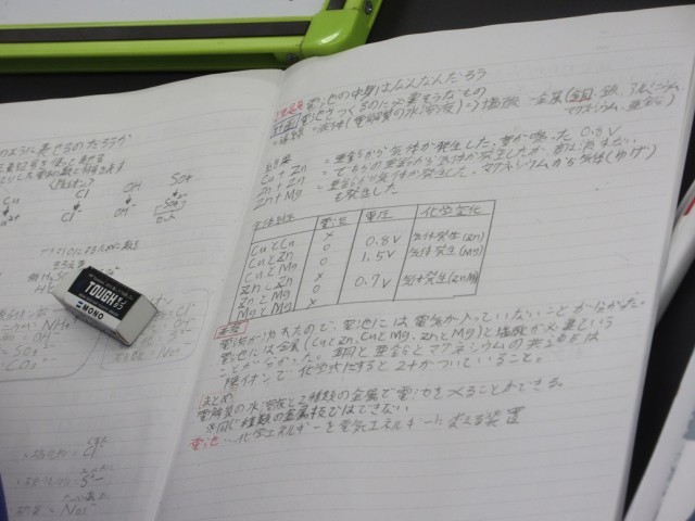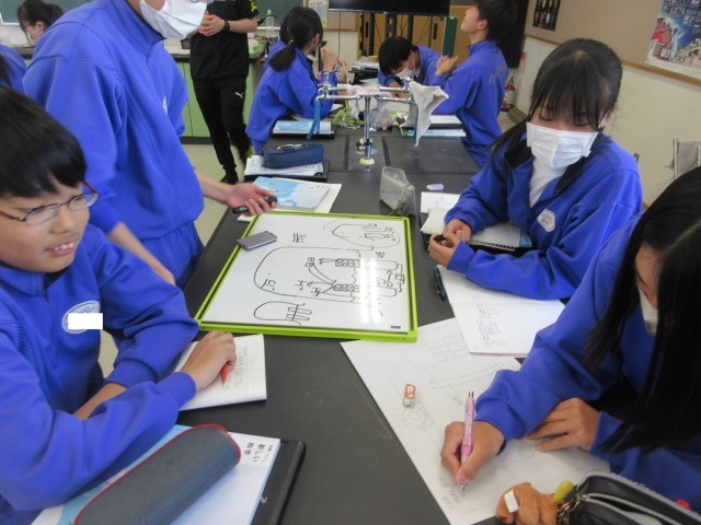 塩酸に種類の違う金属板を入れると、電気が取り出せる理由について考えました。班ごとに電子のモデルを用いて、電気エネルギーの仕組みを予想しました。