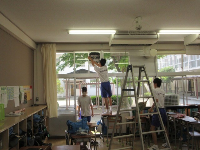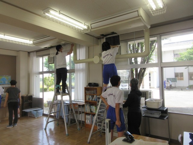午後、全校でグリーンクリーン作戦を行いました。保護者や小野地区民生児童委員の方々にもご協力いただき、植え込みの剪定や教室の扇風機やクーラーの掃除、樹木の消毒、側溝の清掃、校庭の除草、学校周辺のゴミ拾い等を行いました。生徒たちは、自主的にてきぱきと作業し、とてもきれいにしていました。暑いなかでしたが、協力して作業する姿が印象的でした。保護者、地域の皆様、ありがとうございました。ご苦労様でした。