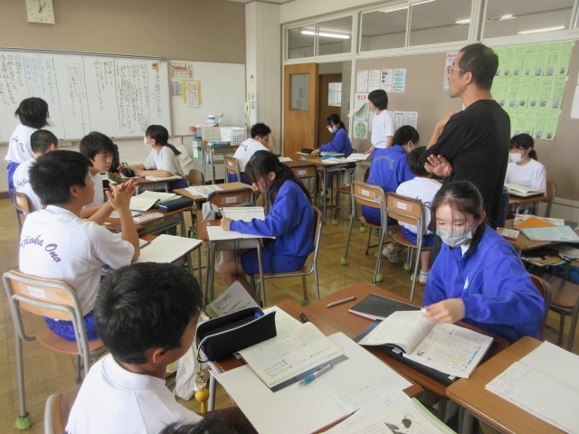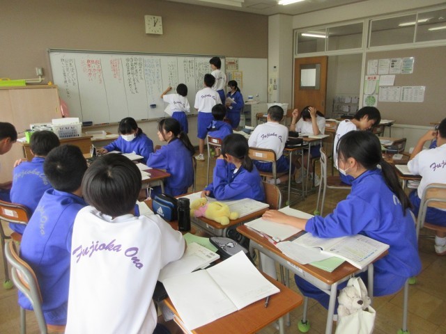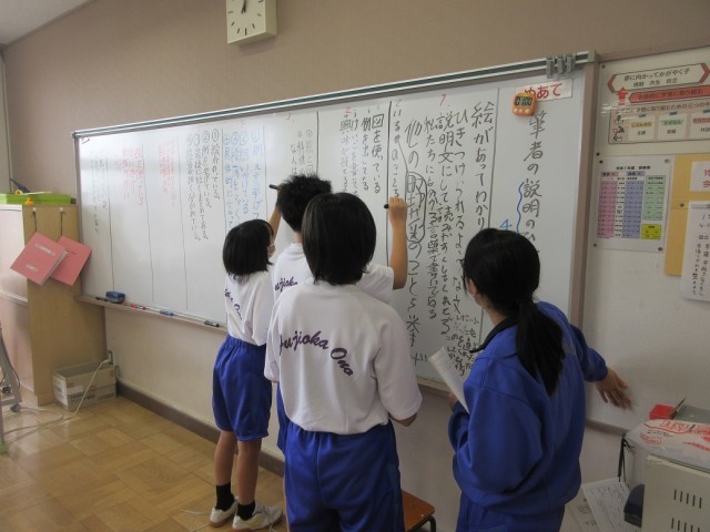 説明文を教材に読解の学習です。筆者がどんな工夫を用いて文章表現しているか班で考えました。たくさんの意見が発表されました。