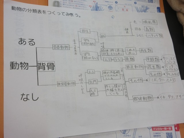 6月17日(火)授業の様子(1年2組 理科) 公開日 2025/06/17 更新日 2025/06/17 できごと 「動物や植物の分類」の単元のまとめを行っています。分類表をつくりながら、動物や植物の分類について振り返りを進めました。