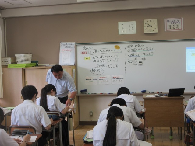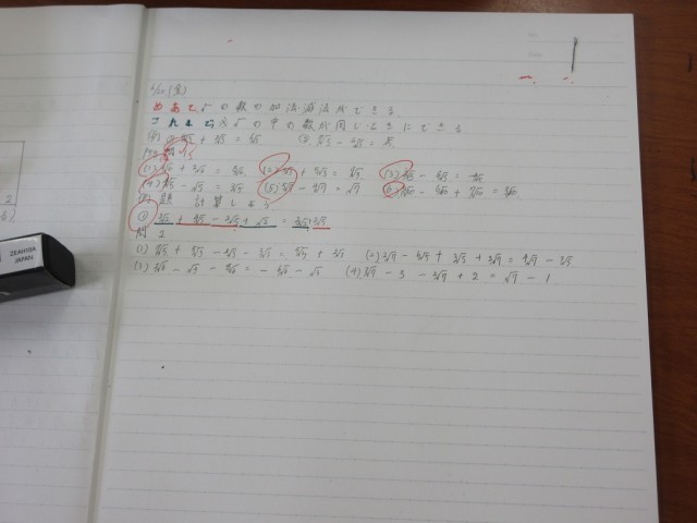√の数の加法・減法を行いました。例題を解きながら、計算のポイントに慣れていきました。ポイントに慣れ、数多く問題を解くことで、正確に計算できる生徒が増えています。