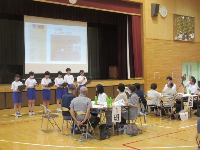 懇談会を前に小野中生徒会本部役員が、いじめ問題解決に向けた児童生徒の取組を発表しました。いじめ問題を自分事として真剣に考え、行動している様子が伝わる、素晴らしい実践発表でした。