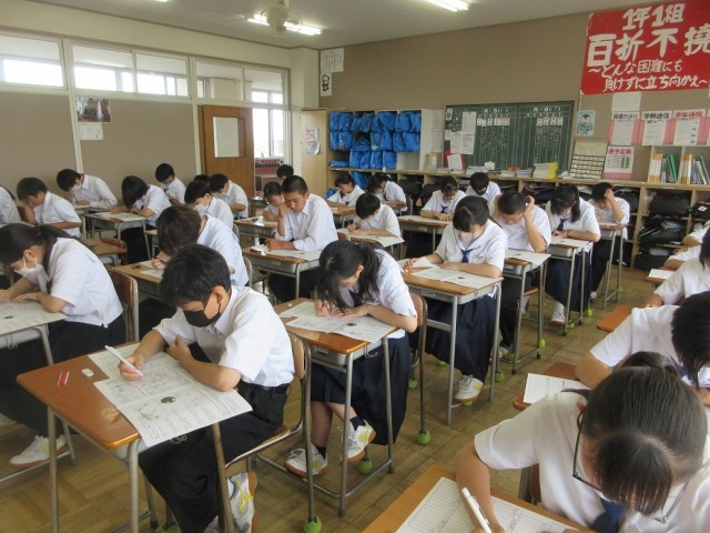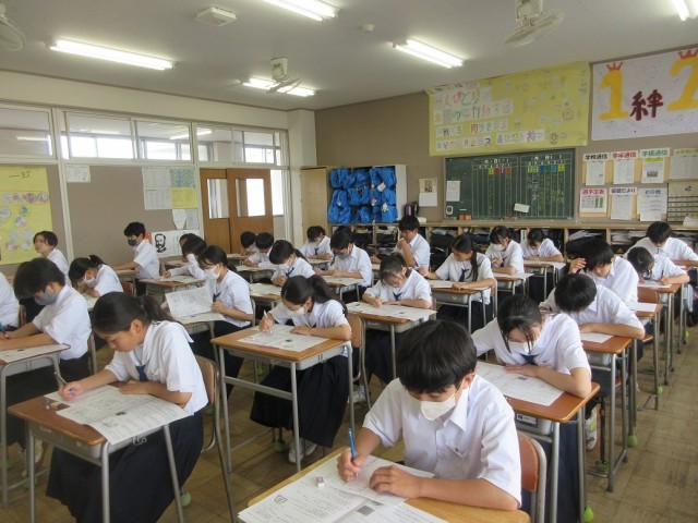 1学期の期末テストが始まりました。1日目は、社会、技家、国語、英語です。1年生にとっては初めての定期テストになります。普段、元気な1年生も、テスト前の教室は、緊張感に包まれていました。