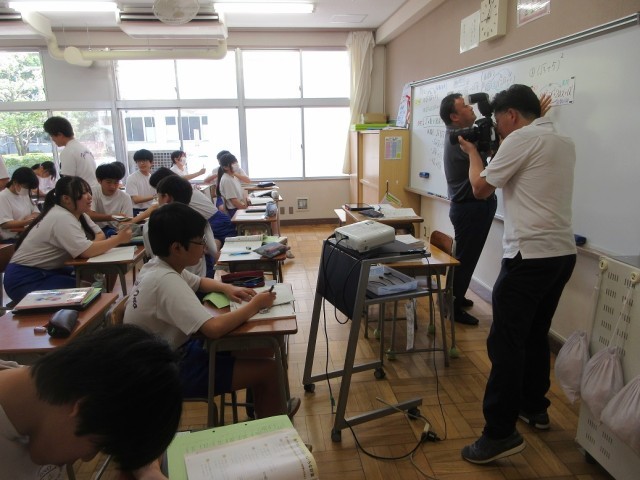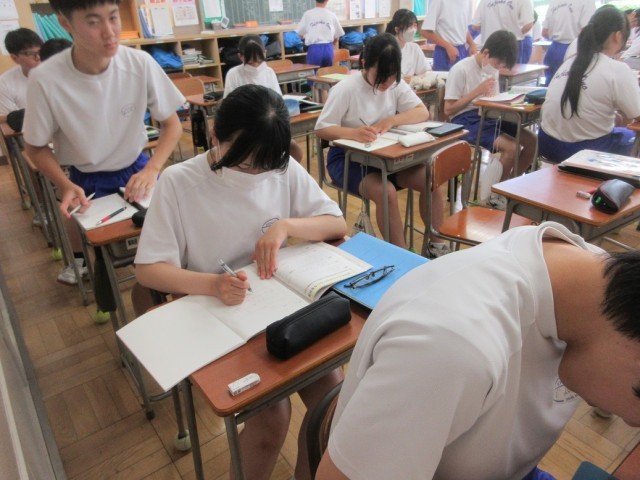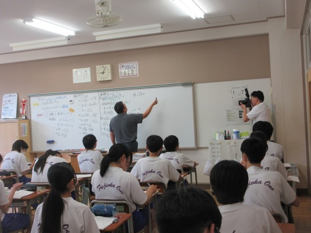 √を含む式の展開の学習です。既習の分配法則を使った計算に丁寧に取り組んでいました。途中、卒業アルバム用のスナップ写真撮影がありましたが、気をとられず集中して課題に取り組んでいました。
