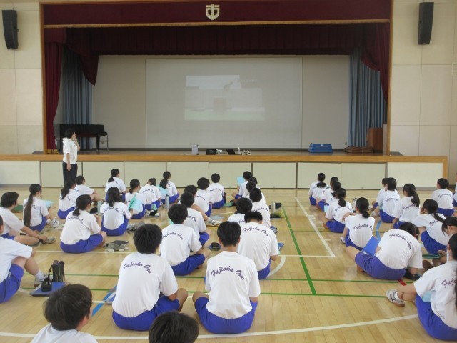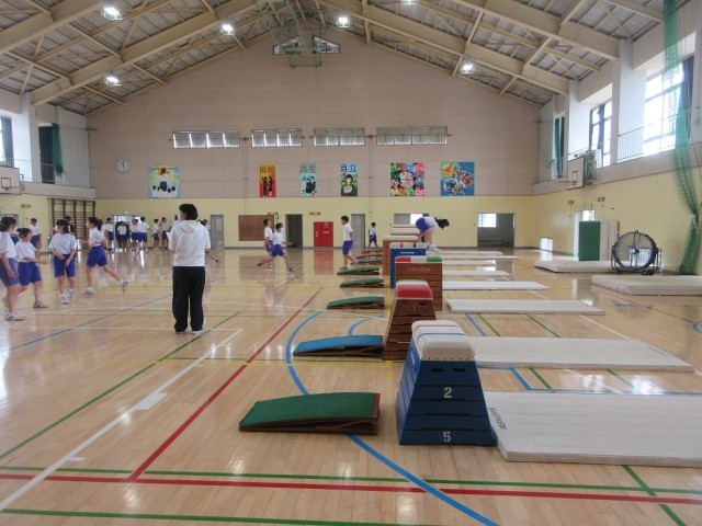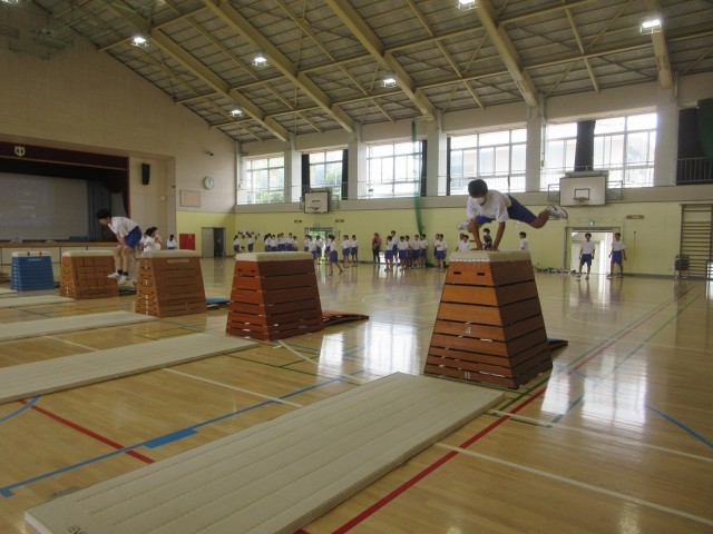 跳び箱運動の単元です。小野中の跳び箱に加え、小学校からも跳び箱を借りて様々な試技の場を設定しました。映像を見ながら技のポイントを確認し、自分に合った跳び箱で抱え込み跳びにチャレンジしました。