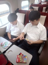新幹線車内でも勉強!?怪しいカードゲーム!?各々の過ごし方をしています。楽しく行...