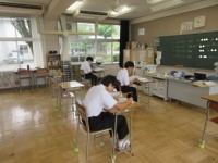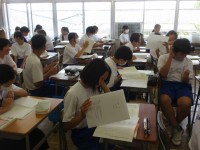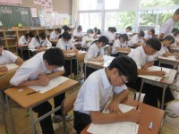 期末テストの返却です。点数を見て、喜ぶ生徒、解答用紙を見直す生徒、正誤を確認す...
