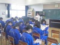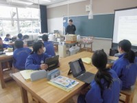 国語は自分の考えをノートにまとめているようすで、2人の先生が1学年を担当しています。家庭科は班ごとに家庭の役割を考察している場面です。