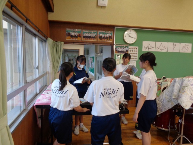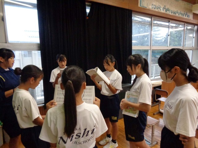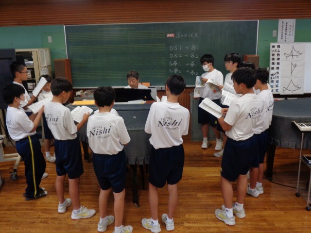 1年2組の音楽の授業は、合唱曲「HEIWAの鐘」の練習中。パートに別れて音取りをしていました。ソプラノ、アルトはCDに合わせて元気よく歌っていました。男声は先生にピアノで音取りをしてもらいます。男声は低音でハーモニーを支える役割なので、頑張って音を取りましょう。