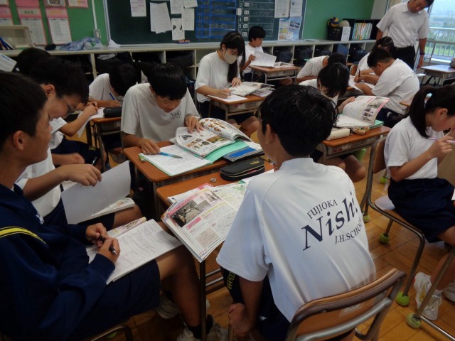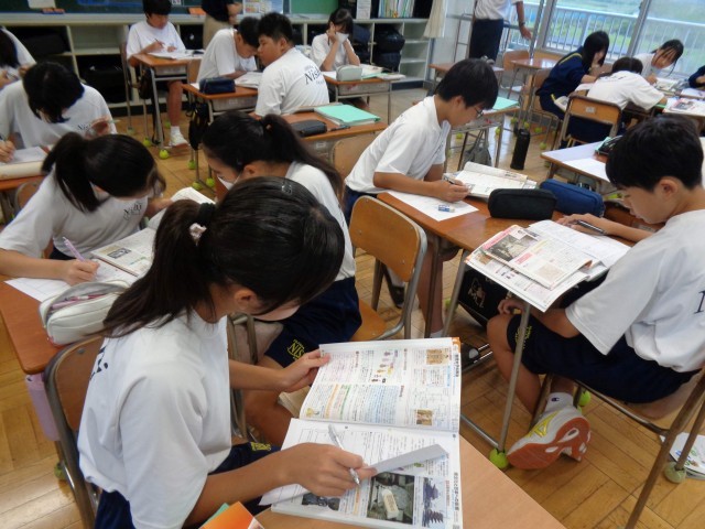 1年3組の社会科は聖徳太子の政治について学習していました。中国大陸で隋が中国を統一して大帝国をつくり、東アジア諸国が緊張状態にあったこの時代。当時の国際情勢を背景として日本のヤマト王権がどのような政治を行っていったのか、聖徳太子の政策とその目的を調べました。みんな、教科書や資料集を使ってワークシートの課題に一生懸命取り組んでいました。