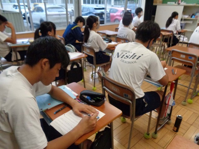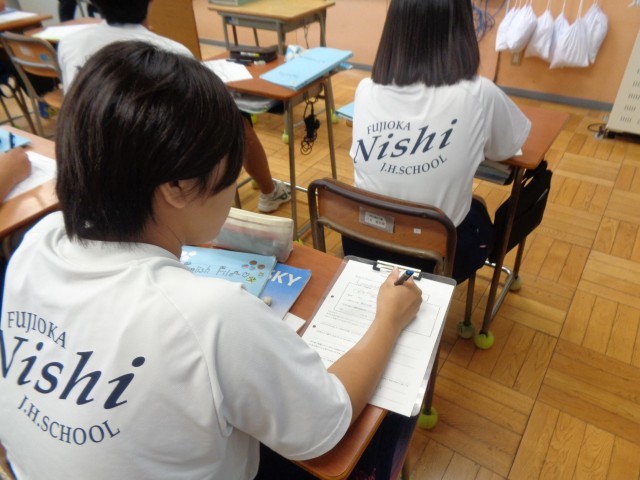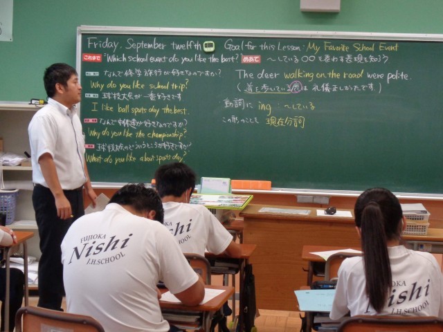3年3組音英語の授業は「好きな学校行事」についての単元。今日は過去分詞を使って伝えたいことを表現します。例文の「The deer walking on the road were polite.」(道を歩いている鹿は礼儀正しかったです)は、修学旅行の思い出でしょうか。「~ing 」を使って今日のめあての「~している〇〇を表す表現を知ろう」を達成できるように頑張ります。ワークシートを使って一人一人がしっかり学んでいました。