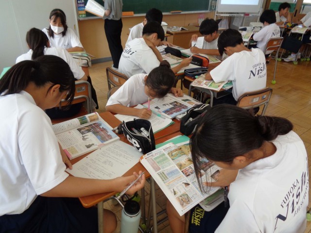 1年2組の社会科は、国風文化の学習です。遣唐使が停止された後生まれた日本独自の文化について、教科書や資料集を使って調べました。先生から提示された当時の文化についての画像を見て、具体的な特色をとらえました。ワークシートに調べたことを黒板に書いたり先生の発言に対して反応したりと、意欲的な取り組みができました。