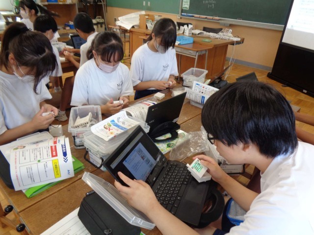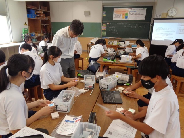 さて、2時間目の3年1組の技術科の授業の様子です。「アーテック・ロボの動作確認をしよう」というめあてでプログラミングの学習をしました。先生の説明をよく聞いた後、本体を組み立ててサンプルプログラムの1~9に取り組みます。タブレットで確認したり先生に質問したり友達と相談しながら、楽しそうに活動に取り組んでいました。