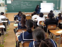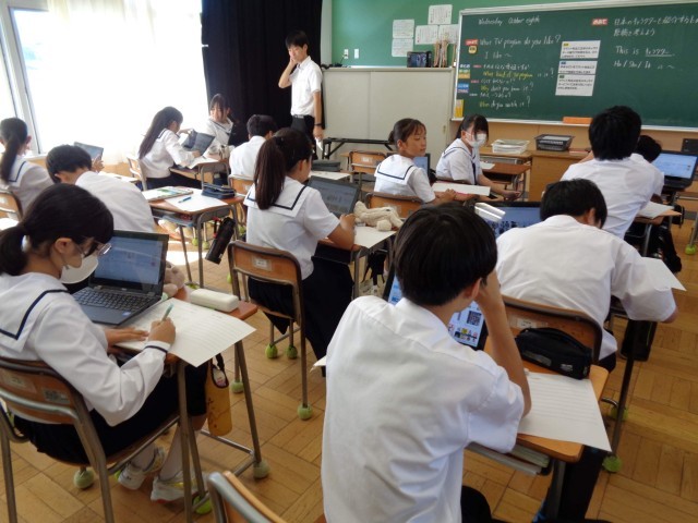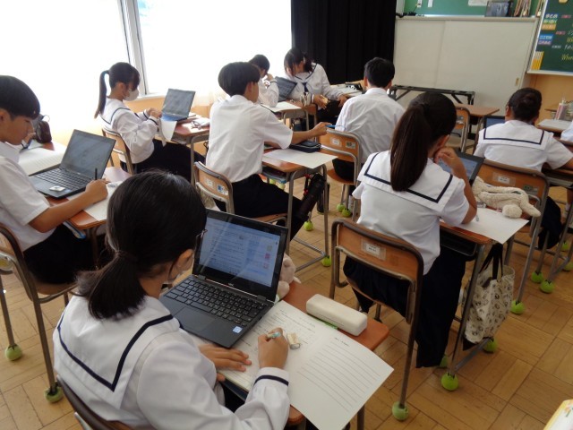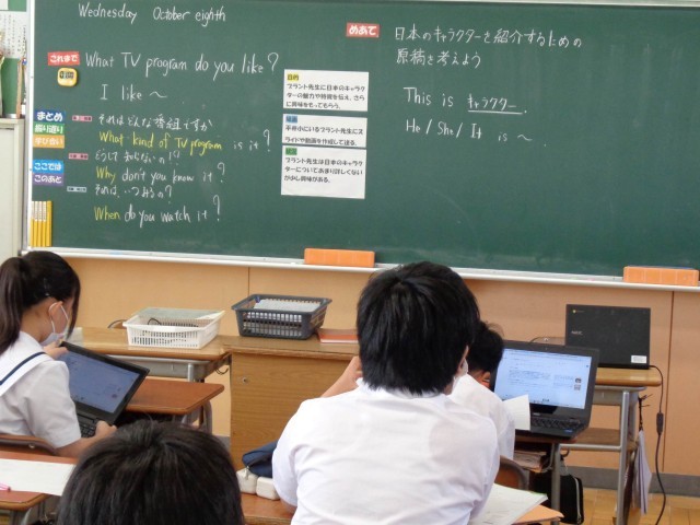 1年2組の英語の授業では。「日本のキャラクターを紹介するための原稿を考える」学習をしていました。タブレットを使ってキャラクターについて調べたら、それを紹介する英文を考えます。これまで学んだ英語表現を使って相手に伝わるように文章を作ります。紹介する相手は平井小のALTの先生です。相手に伝わるように、興味を持ってもらえるように工夫します。わからないことは、先生やALTの先生に質問して原稿作りを頑張っていました。