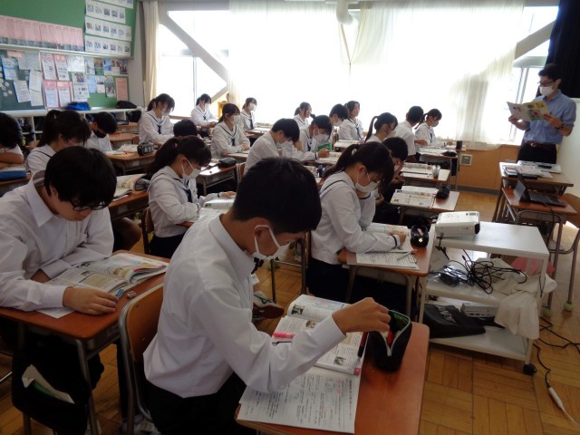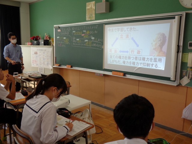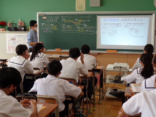 「えん罪」が生まれないためには何が大切か、裁判員制度をはじめとする司法制度改革とはどのようなものかを調べました。司法とは我々の人権を守る最後の砦です。人権尊重の原則で公正な裁判が行われていく必要がありますね。先生が司法制度についての様々な資料をわかりやすく提示してくれたので、生徒達は興味をもって司法制度について学んでいました。