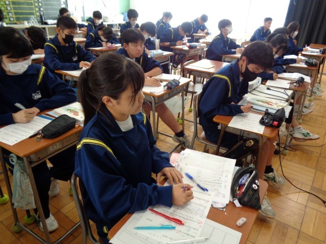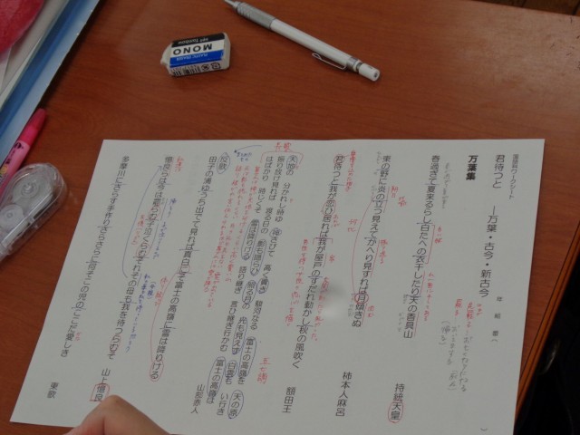 万葉集の歌は、奈良時代、古代国家の草創期に作られた歌なので、素朴さ・素直さ・力強さが特色といわれています。「春過ぎて夏来るらし白たへの衣干したり天の香具山」や「東の野に炎の立つ見えてかへり見すれば月傾きぬ」などが有名ですが、情景が目に浮かぶような歌ですね。言葉の意味や時代背景なども調べながら、ワークシートにしっかりと記述して和歌の表現を味わいました。