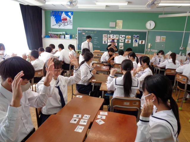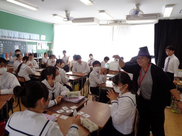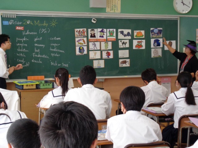 もうすぐハロウィン。2年3組の英語では、ALTの先生がハロウィンにちなんだ言葉やハロウィンの行事を英語で紹介していました。