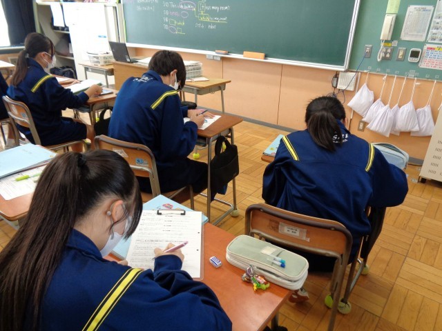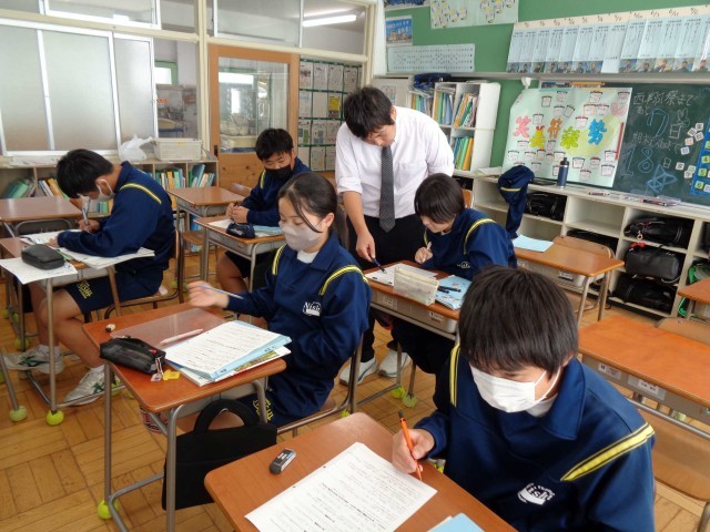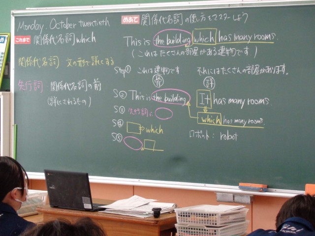 3年3組の英語では「関係代名詞」を学習中。これまで学んだ関係代名詞の用法を使って英文を作ります。ワークシートの日本文を関係代名詞を使って英文にできるかな?今日のめあては、「関係代名詞の使い方をマスターしよう」ですから、しっかりマスターできるように、既習事項を確認したり先生に質問したりして頑張りましょう。