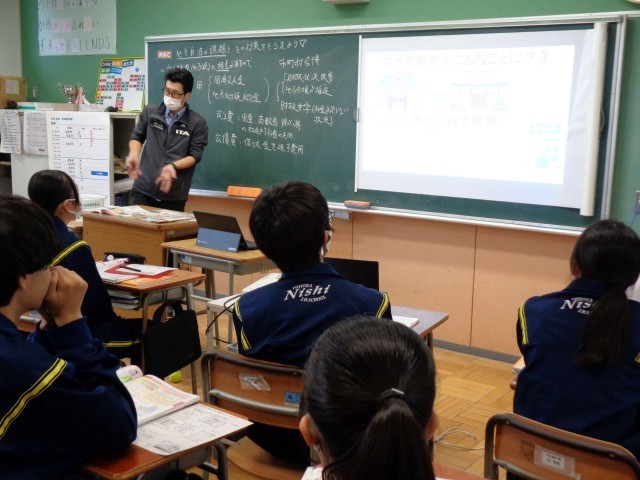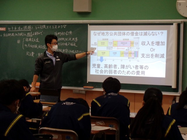 3年3組の社会科では、地方自治の課題について考えていました。自主財源の格差や少子高齢化に伴う収入源と支出増など、地方公共団体が直面する課題は山積しています。北海道夕張市が財政破綻から再生していったことや、他にも財政破綻の危機に直面している自治体があることなどを学習し、地方自治の課題について自分事として一人一人が考えていました。