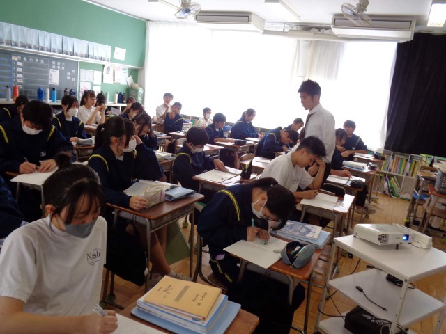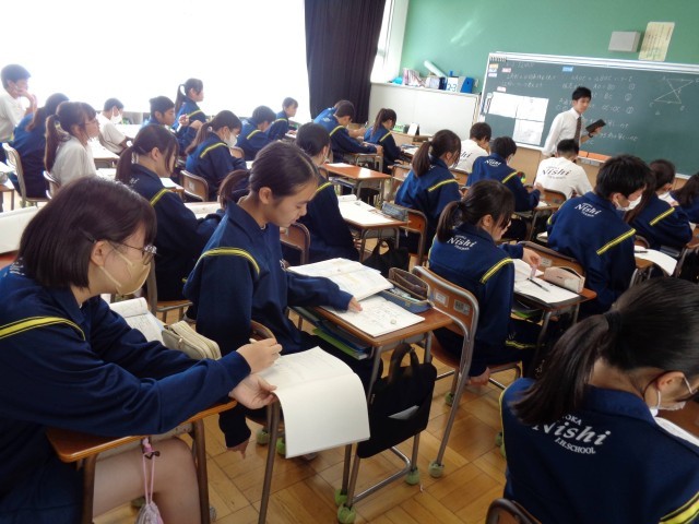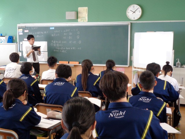 2年3組の数学では、三角形の合同条件をつかった証明について学習していました。「これまで」学習したこと使って今日のめあてにせまります。根拠となることがらをよく整理して筋道立てて書くことが「証明」には必要ですね。近くの人と相談したり、全体で確認し合いながら課題に取り組んでいました。