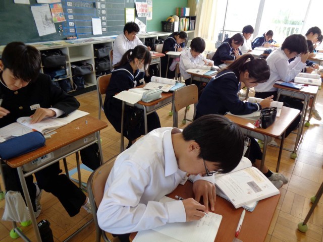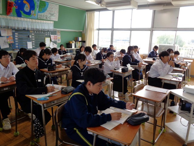 1年3組の数学の授業。比例・反比例を学習中です。今日は、これまで学習したことを使って反比例についての問題や比例のグラフの読み取りの問題に挑戦。先生の問いかけに積極的に答えて、意欲的に問題に取り組んでいました。