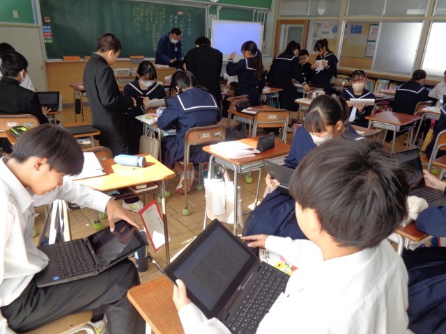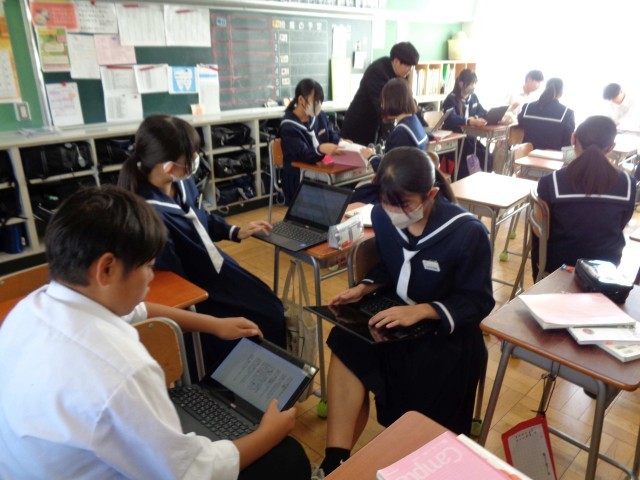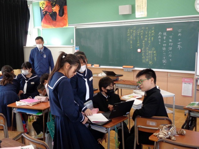 1年1組の国語の授業では、「古典の世界」の学習中。この単元で学んだ「竹取物語」以外にどんな作品があるのか、古典の物語や随筆を調べて発表する活動をしていました。グループにわかれて協力して調べます。徒然草や枕草子などの随筆や今昔物語などをタブレットを使ってまとめていました。グループで楽しそうに相談しながら取り組んでいました。