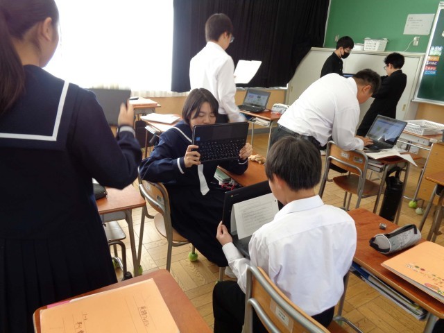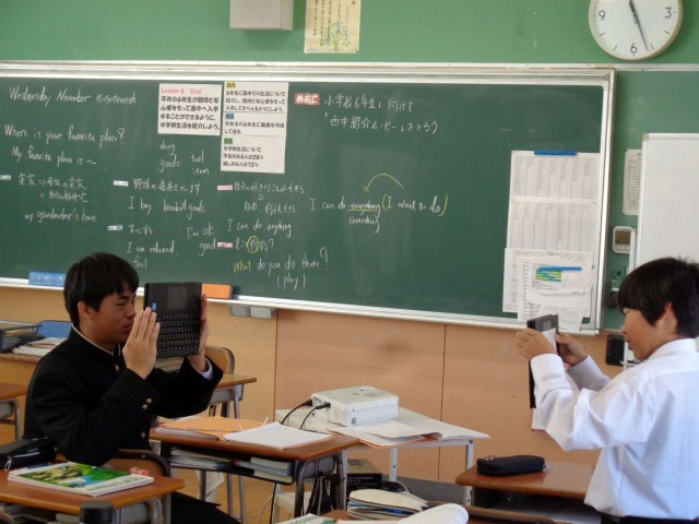 1年3組の英語の授業では、小学6年生に西中の生活を英語で紹介する活動の最終段階に取り組んでいました。これまでに準備した英語の紹介文を読みながら、西中の様子を撮影した映像を見せます。今日は、映像を見せながら英語で話し、それを友達にタブレットで撮影してもらいました。みんなで教え合ったり協力したりして、一生懸命活動に取り組んでいました。