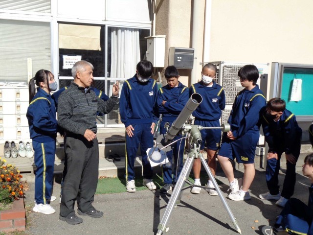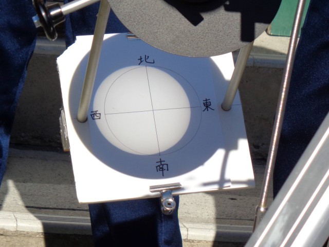 3年1組の理科では校庭で太陽の黒点の観察をしていました。きれいな秋晴れで絶好の観察日より。天体望遠鏡を使って太陽の投影させます。太陽を直接望遠鏡で見たら大変なことが起こりますので、どうすれば投影できるのかを先生が説明してくれました。なるほど~と納得したところで、いざ太陽の像を投影。きれいに像が映り、よ~くみると小さな黒点が・・・。さて、観察をしていくことでこれから何がわかっていくのかな?