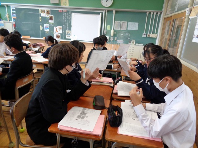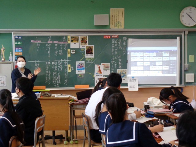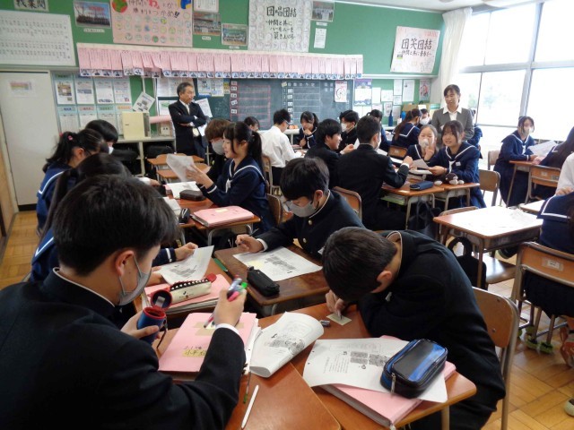 2年生の国語で校内研修の公開授業をしました。2年1組の公開授業を見に行くと、校長先生と教頭先生が参観していて緊張感のある授業が行われていました。期末テスト前から取り組んできた「平家物語」の「扇の的」の場面について源氏側の3人の人物について話し合います。3人それぞれの立場にたって考えて自分の意見をまとめ、グループで意見交流をしました。那須与一が見事扇の的を射貫き、それを敵味方ともにやんやの喝采をする爽快な前半と、その与一を讃えるかのように舞う平家の男を「命令だ」といわれて与一が射倒してしまうなんとも後味の悪い後半との対比が印象的な文です。生徒達はなぜ与一が男を射ってしまったのが、与一の身になって真剣に話し合っていました。