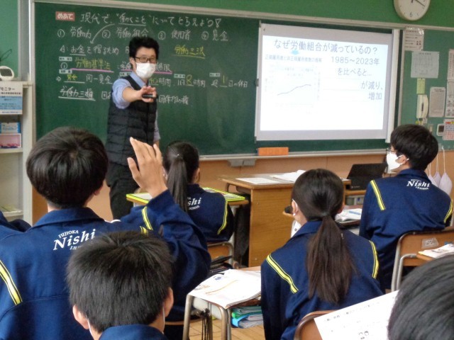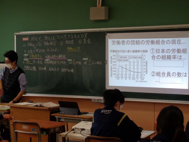 3年3組の社会科では「働く意味と労働者を支えるしくみ」について学習していました。憲法で保障されている「勤労の権利」を守るためにどんな法律があるのかを調べた後、労働組合について考えました。日本の労働組合の組織率や組合員数の変化をグラフをもとにみんなで考えた後、労働組合の役割についても考えました。その中で出てきた「過労死」という言葉。2年生の社会科でも、今日は産業革命の下の過酷な労働条件について学んでいましたが、3年生は現代社会の話。先生が、報道番組の映像を見せてくれて、今の労働者の課題について考えました。