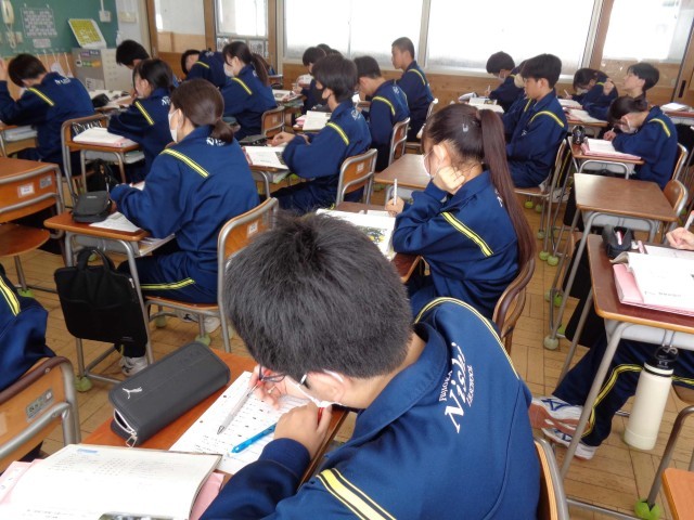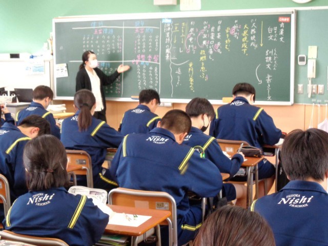古典を学習中の2年の国語。今日の2年2組は、漢詩の学習をしていました。これまで学習した「漢文」の読み方などを復習した後、これから学ぶ「漢詩の風景」に出てくる「五言絶句」と「七言絶句」の組み立てを「律詩」と比較しながら調べました。「漢詩の風景」に出てくる「春眠暁を覚えす」などは、春になるとよく皆が口にする有名な一節です。日本の文化に大きな影響を与えた「漢詩」の世界をよく味わえるといいですね。