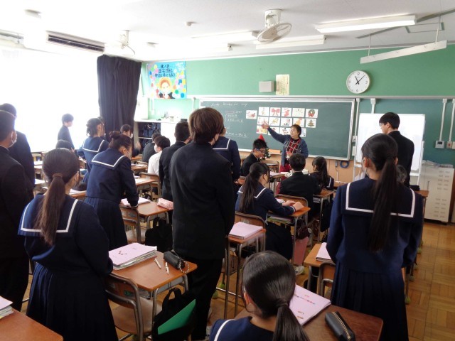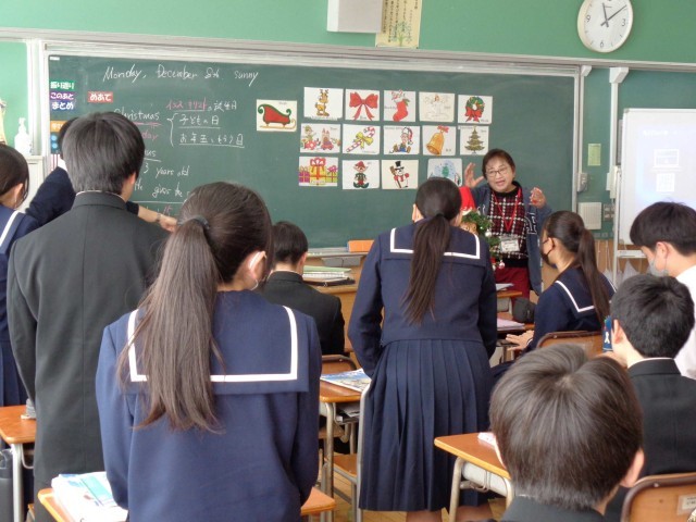 2年1組の英語の授業。もうすぐやってくるクリスマスにちなんだ授業でした。ALTの先生が紹介する外国のクリスマスの様子を聞き取って、先生からの質問に答えます。日本では楽しい年末のイベントであるクリスマスですが、キリスト教徒の多い国では、教会に通ってお祈りをする敬虔な行事です。クリスマスソングやサンタクロースについてなど、いろいろなお話を聞きました。英語のお話をよく聞き取れたかな?