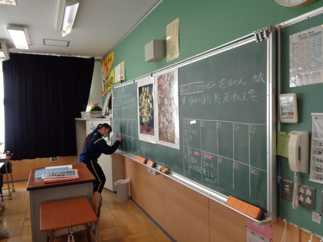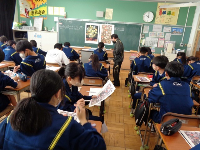 3年2組の美術の授業。西洋の油絵と日本画の2枚の花の絵を見比べて違いを鑑賞しました。両方とも花々が美しく描かれていますが、それぞれの手法にどんな違いがあるのかな?みんなじっくりと絵を見て表現の違いを見つけていました。
