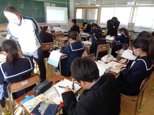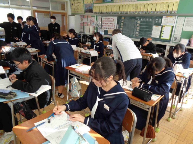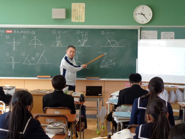 今日の1年2組の数学の授業は、校内研修の公開授業でした。「これまで」学習した基本の作図を使って、今日は「75°の角を作図して、その方法を説明する」学習です。方法は何通りもあります。どんな考え方でどのように書けば良いか、よ~く考えて課題に取り組みました。