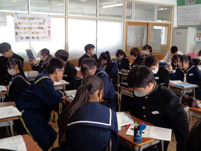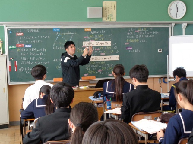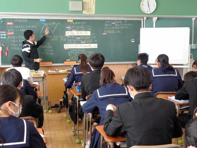 今日の2年1組の数学の授業は、校内研修の公開授業。「平行四辺形になるための条件」についての学習です。「これまで」学んだ平行四辺形になるための条件は、4つ。今日は「1組の対辺が平行で等しい」四角形は平行四辺形かを証明します。「これまで」の学習を使って証明できるかな?じっくりと問題に取り組み、周りと意見交流をして学び合いをしていました。